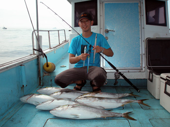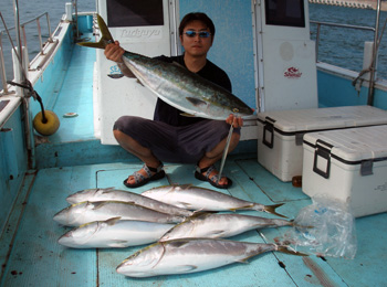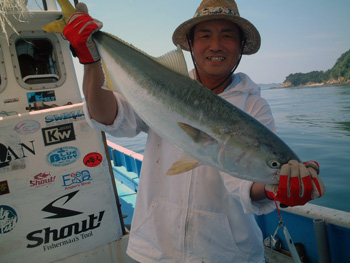 いつもありがとうございます。大変遠い所、茨城から7名でご同行頂きました。この日は半日だけの釣りでしたが、4.5〜6キロまでのハマチが12本キャッチ。バラシも多少ありましたがアスナロUで良くアタリました!