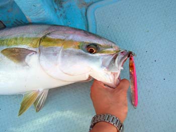 7月10日のブリ、メジロのヒットパターンはストップを交えつつの早巻き。中層20mくらいでのヒットでした。