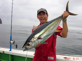 反応が出ているが誰にもアタリが無く、ジグをアスナロUに換えて、1投目で17キロのカンパチがヒット。次の流しも小型ながらカンパチをキャッチ。すぐに南氏もアスナロUに換えてイソマグロをキャッチしたそうです。