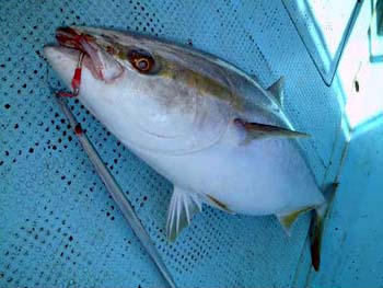 午前中の満ちは風が強く潮も大きく、あいの瀬を流せず、何日か前から学校前で釣れてるということで、そこを流す事になりました。が、そこはご存知ルアー禁止の場所なので、始めは餌釣りになりました。