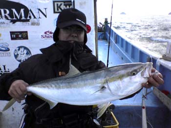 上げでも潮が効きだしてからアタリだし、皆で15本のハマチを追加した。この日の上げでの私のヒットパターンはアスナロを3回速く巻き、止めを入れる時に強めにジグを跳ね上げラインスラッグを入れている時に良くアタってきた。