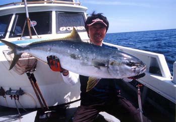 湯池氏が六角棒200gシルバーでヒラゴクラスをキャッチし、さらに7.5キロのヒラマサを釣り上げた。