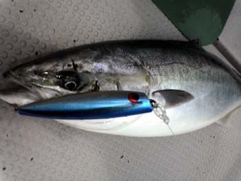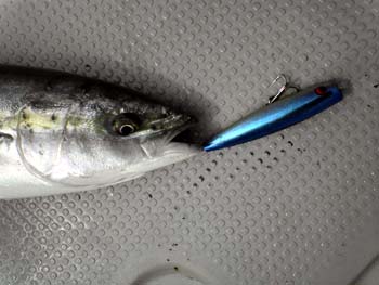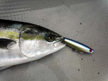ナブラが出ていない時も水面をヨタヨタさせていると、上を意識しているヤズを引き出せた。