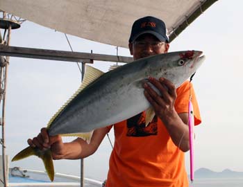 中層ダダ巻きでのヒットだった。サバを追いかけてハマチが水面を走る姿も確認できたが、上の方でアタってくる魚は小型が多いようだ。