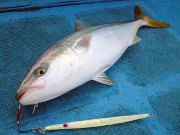 クダコに到着してまずは鯵釣りから。前回の反省からナブラがいつ出ても良いように、今回はキャスティングロッドにゴムヨリをつけて、鯵釣りをして、ナブラがでたら、すぐに付け替えてキャストしようと思いましたが、そこは、おきまり!前回のようには、ナブラは出ません。が、学校前で鯵釣りをしていて、キャスティングロッドがかなり曲がり、ドラックも止まらないのが二度ありました。ハリスが4号で、二回とも切られました。そう君の話では、「はまちがこの間から入っている」との事。