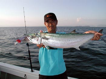 サワラが飛んだと聞き、キャビンから出てポッパーを投げた。遅れたかな?と思いつつ、スプラッシュさせていたら、ポッパーを咥えてサワラがジャンプした。