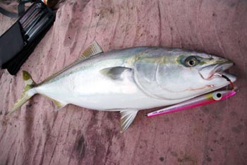 このサイズのヒラマサが良くあたってきます。数を釣るのでれば、早巻き&キビキビ動かすと良く釣れます。