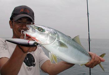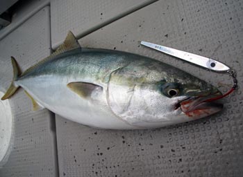 ジギングではベイトの反応のまわりにいたハマチがヒットした。