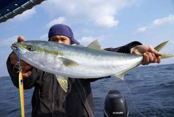 最初のポイントでは漁師さん達がマルゴ(ハマチの60〜70cmクラスのこと)を上げていた。